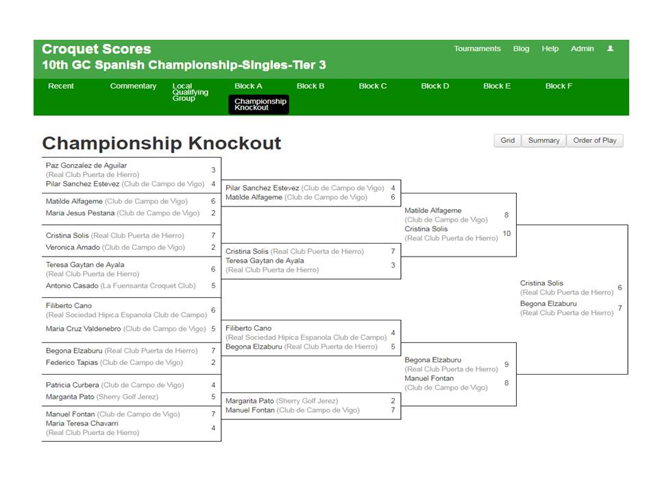 Begoña Elzaburu ha sido la vencedora del X Campeonato de España de Croquet GC, en su tier 3, al vencer en una emocionante final, que no se decantó hasta el último aro, a Cristina Solís por el resultado de 7/6. Manuel Fontán, que perdió por 9/8 con Begoña Elzaburu, y Matilde Alfageme, que lo hizo por 10/8 con Cristina Solís, fueron los semifinalistas. La competición se ha celebrado del 20 al 22 de octubre en la Real Sociedad Hípica Española Club de Campo de Madrid, club al que la Federación Española de Croquet (FEC) quiere dar sus más expresivas gracias por brindar sus magníficas instalaciones y su capacidad organizativa para que esta competición pudiera llevarse a cabo con tanto éxito.